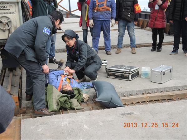 “6号墩处有一名工人从架板机上触电坠落摔伤,伤者昏迷,情况紧急,请求援助……”12月25日下午15:00,随着一声声急促的报告,由宜昌市交通运输局主办,宜昌市公路管理局、宜都市交通运输局、宜都市公路管理局组织实施的枝城长江大桥公路桥维修加固工程安全应急演练拉开序幕。