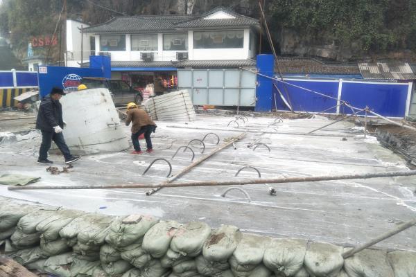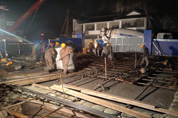 1月15日凌晨6点,在三游洞岸缆索吊后锚工地现场,工人们就开始了一天的忙碌,对缆索吊后锚基础浇筑施工做最后的准备工作。9时许,混凝土浇筑施工开始。由于施工场地和环境的限制,施工速度比较缓慢。施工人员同时在本已狭窄的施工现场又开辟出2个进出口通道,投入共计5台运输罐车轮流运输混凝土。施工人员一边浇筑混凝土,一边对斜桩预埋件进行焊接,争分夺秒,和时间赛跑。夜晚10时许,天空下起了小雨,但施工人员都咬紧牙关,克服恶劣天气,经过17个小时的浇筑施工,于16日凌晨2点,全面完成浇筑任务,共完成混凝土440方、浇筑斜桩2个。