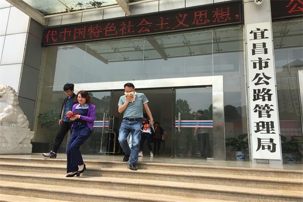 培训结束后,市公路局2018年度消防演练正式拉开帷幕。11点15分,值班人员发现“火情”,第一时间拨打了“119”并按响机关大楼消防警报,市局迅速启动《宜昌市公路管理局灭火和应急疏散预案》,义务消防队员各司其责,全体职工迅速有序撤离。演练活动组织严密、指挥得当、反应迅速、疏散有序,做到了理论与实践的有机结合。