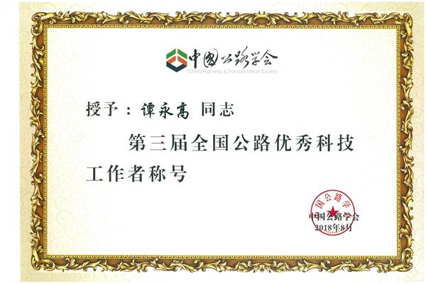谭永高同志荣获“中国公路学会优秀科技工作者”