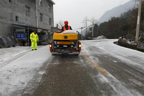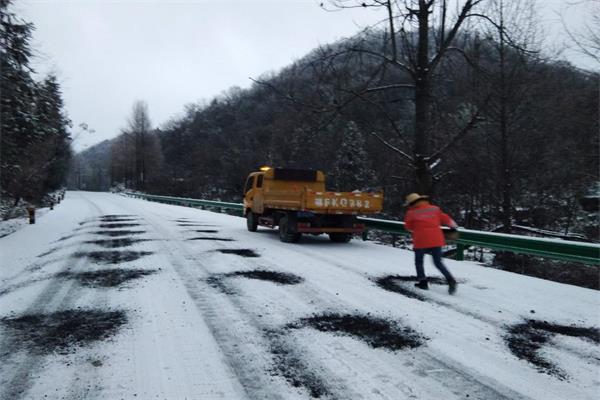 及时处置积雪路段。对易积雪结冰的路段重点监控,做到早发现早处置。对积雪较深的路段采用装载机、除雪车进行清除,并抛洒防滑料、融雪剂,在结冰路段显眼位置设置标志标牌,提醒过往车辆佩戴防滑链,减速慢行注意安全。