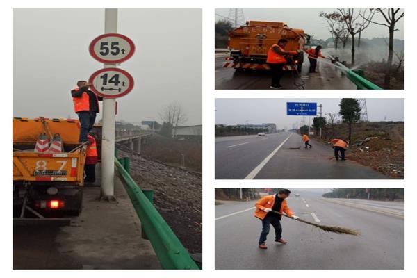 (宜都公路局组织力量对钢护栏、标志标牌等公路附属设施进行全面清理,清扫路面。)