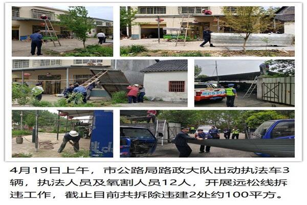 4月19日,枝江市公路局路政大队发起远松线拆违行动,出动执法车三台、执法及施工人员12人,共拆除违建2处约100平方米,标志着宜昌全市国省干线公路路域环境整治行动又取得了新的实质性进展。