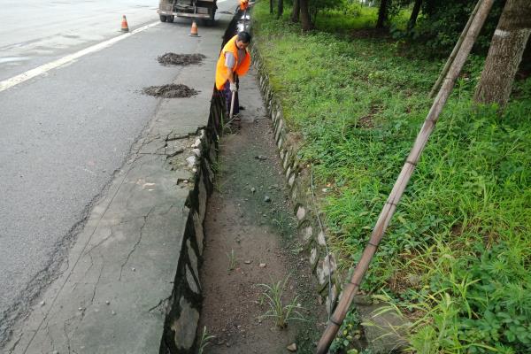(当阳公路养护人员雨后清理公路边沟)