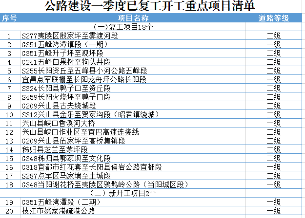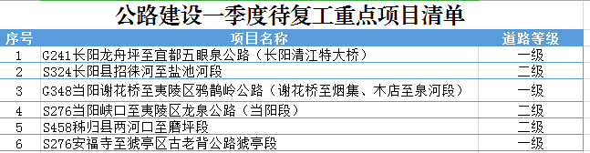 同时,长阳、当阳、秭归、猇亭区等地正在积极进行复工准备。一季度,还将6个公路重点项目相继复工。