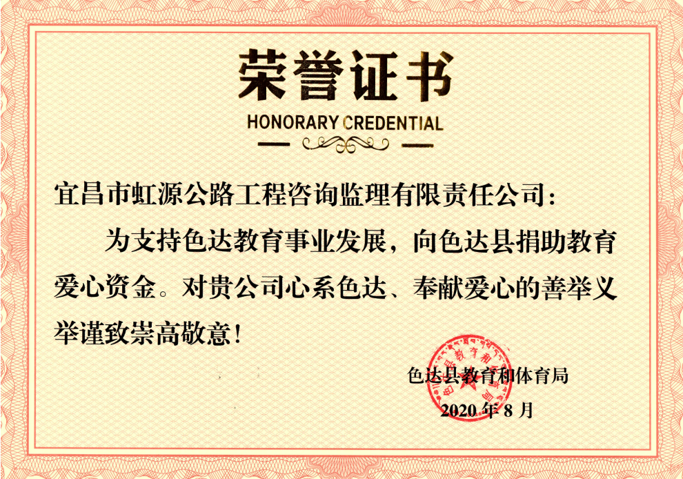 结对帮扶送真情,爱心捐助暖人心。日前,宜昌市公路建养中心直属单位虹源公路工程咨询监理有限责任公司(以下简称虹源公司)收到来自四川省甘孜藏族自治州色达县教育和体育局发来的“荣誉证书”,对公司心系色达、奉献爱心的善举义举致以崇高敬意!
