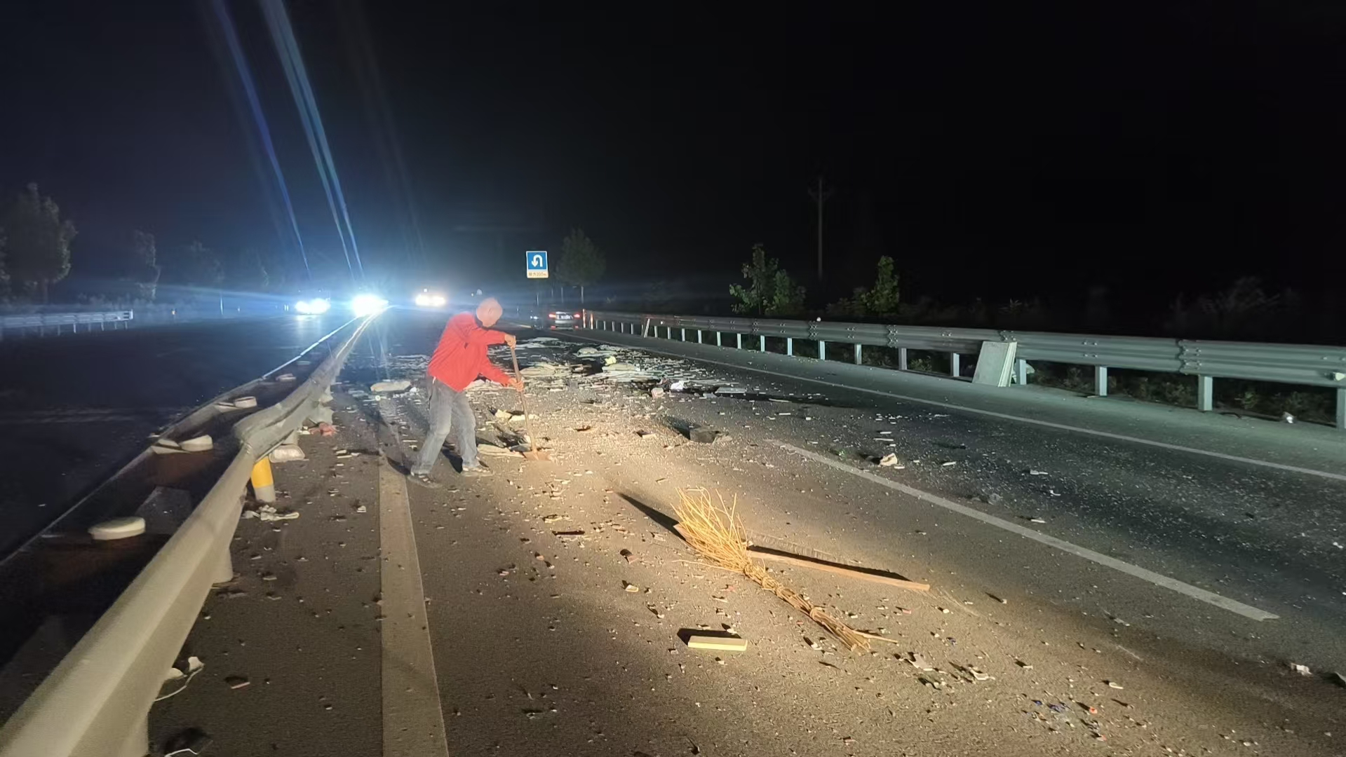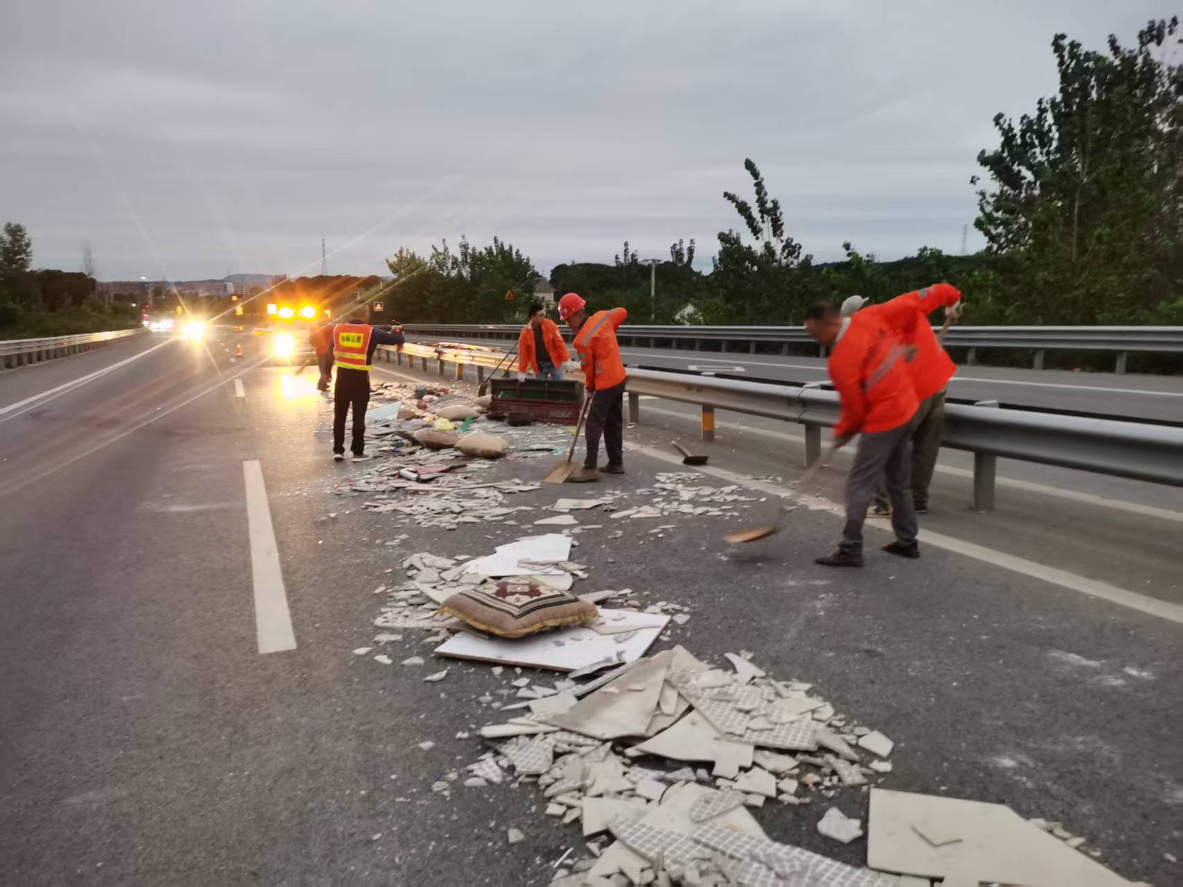 “立即设置警示区,引导车辆缓行!”东阳养护站站长余飞果断指挥。应急人员迅速摆放警示标志,开启警示灯,引导过往车辆有序通过。同时,养护人员手持铁锹、扫帚等工具,将破碎的瓷砖和杂物清理归拢。运输车辆紧随其后,将清理出的杂物装运离场。