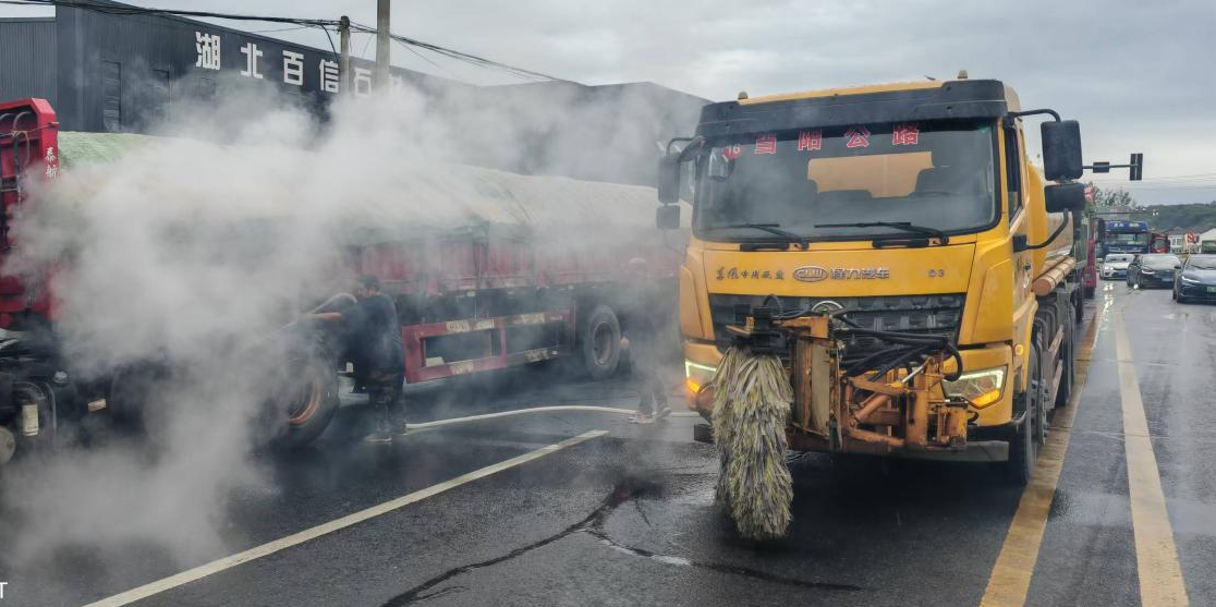 9月29日早晨8时30分,保当线当阳境干溪桥附近上演了紧张而暖心的一幕。一辆行驶中的大货车轮胎突然起火,浓烟伴随火苗蹿起,情况万分危急。附近村民发现后,正自发地用桶接水试图扑救,但水源有限,灭火效率低下,火势未能得到有效控制。